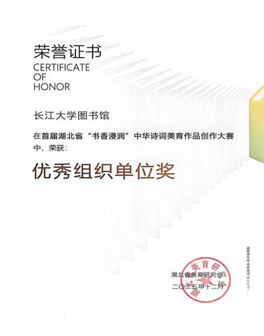 大赛自2025年5月启动,历经在线投稿、专家评审、线下决赛等多个环节,得到全省各高校广泛响应,众多师生踊跃参与,创作出一大批兼具思想性、文化性与艺术性的优秀作品。最终,长江大学图书馆在本次大赛中表现亮眼,斩获多项荣誉:丁慧琳、邓明佳、刘源的作品《朝露待晞》,赵子萌的作品《以美学解如梦令》荣获三等奖;郑攀的作品《关雎》获评优秀奖;李秀芝老师获“优秀指导老师”称号,李楚昭、程彩虹获“优秀组织个人”称号,长江大学图书馆获评“优秀组织单位”。
